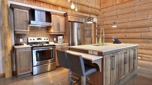 - Color and Finish: Painted cabinets can provide a nice counterbalance to log walls, so consider colors like white, baby blue, or even black or navy.